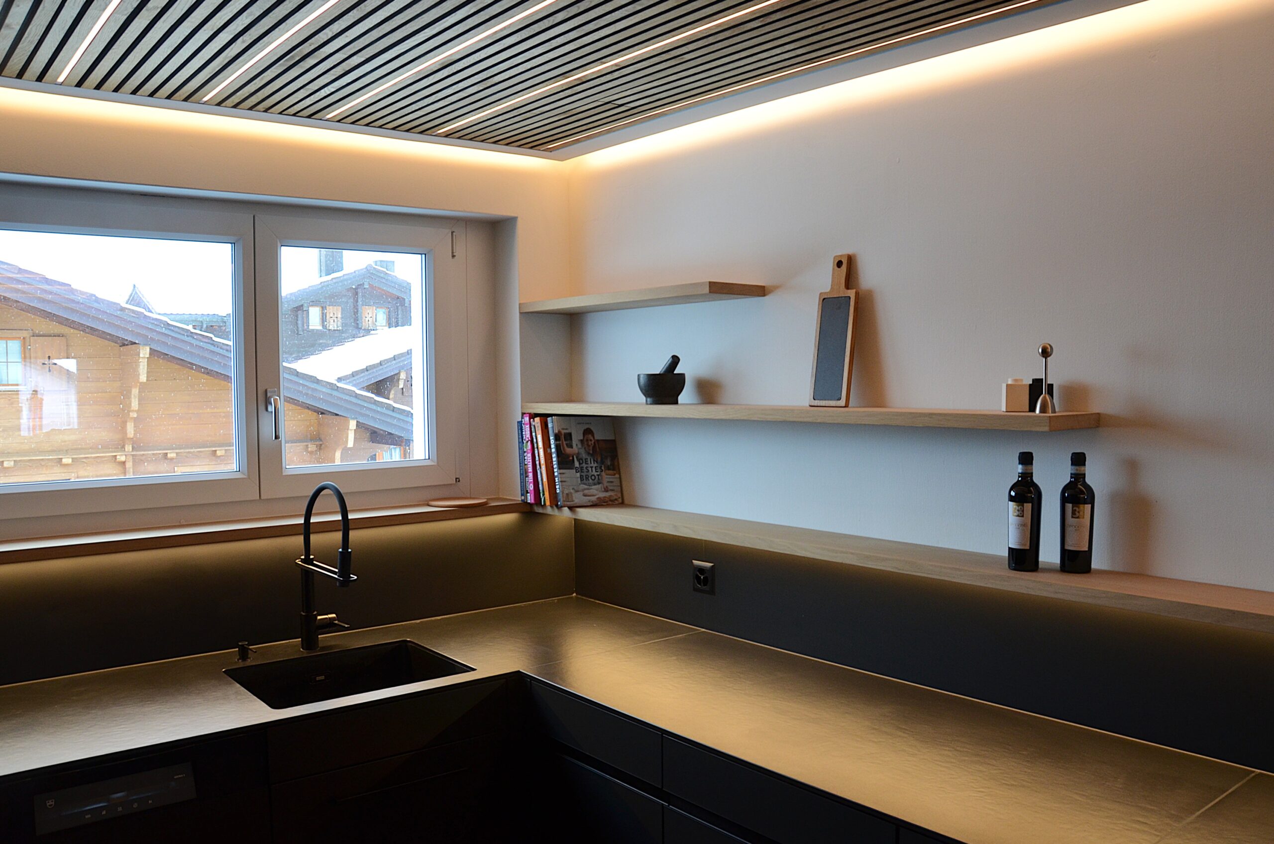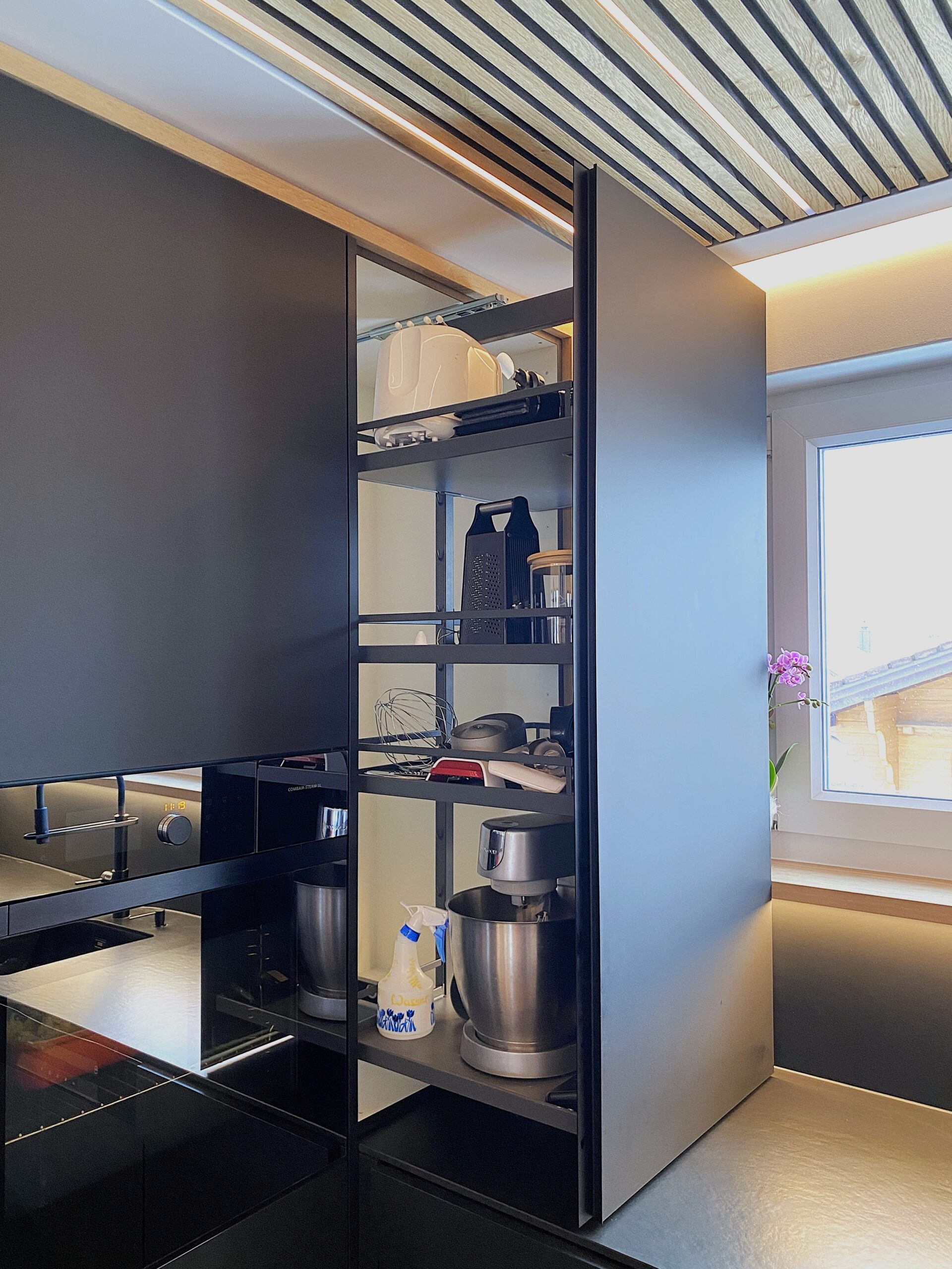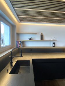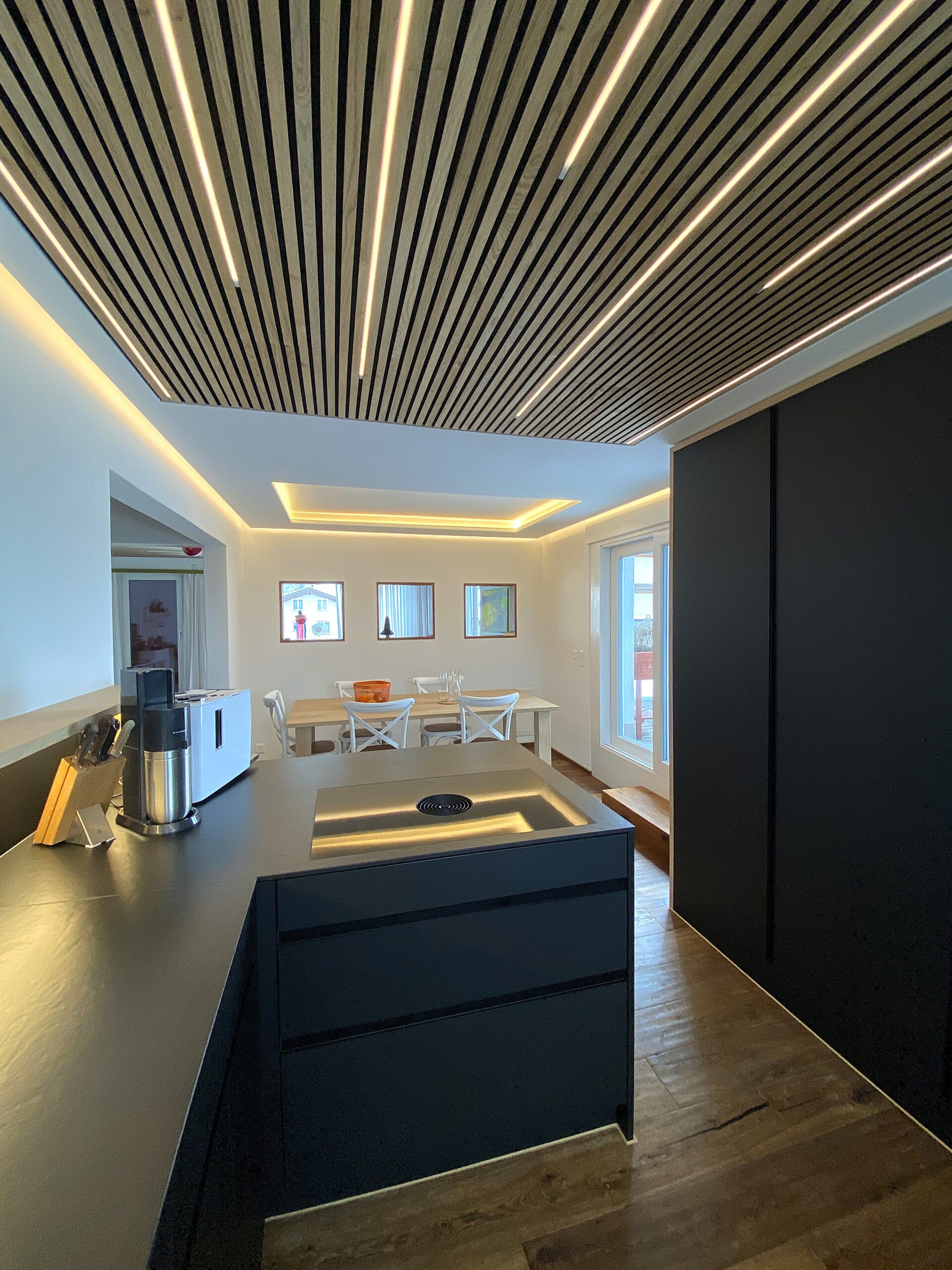 Diese moderne Küche überzeugt durch eine klare Formensprache und sorgfältig abgestimmte Materialien. Ein raffiniertes LED-Beleuchtungskonzept sorgt für stimmungsvolle Akzente, während indirektes Licht im Essbereich eine angenehme Atmosphäre schafft. Für ein stimmiges Raumgefühl sorgt zudem eine Decke mit integrierten Akustik-Paneelen. Hochwertige Materialien prägen das Gesamtbild: Eine Dekton-Keramikabdeckung trifft auf supermatte Fenix®-Oberflächen und elegante Griffleistenprofile in Schwarz. Der Esstisch aus Eiche massiv unterstreicht die moderne Gestaltung. Ausgestattet mit einem Induktionskochfeld von Bora, Küchengeräten von V-Zug sowie pulverbeschichteten Armaturen in mattem Schwarz vereint diese Küche Design, Funktionalität und höchste Qualität.