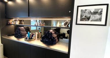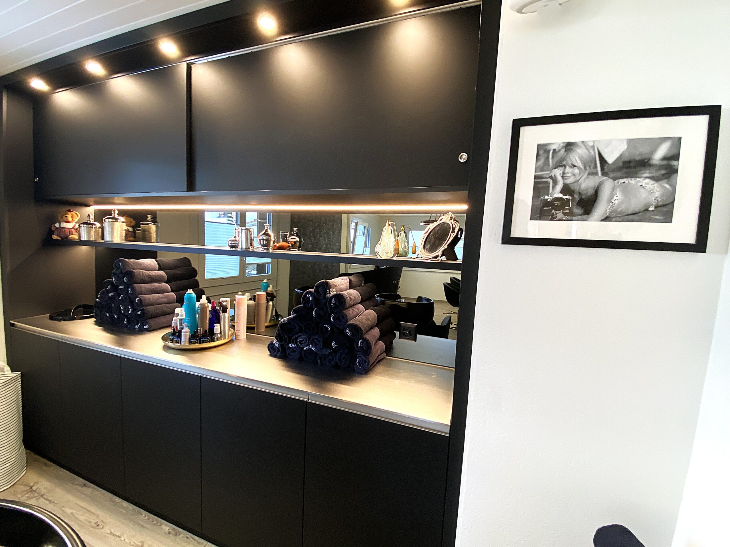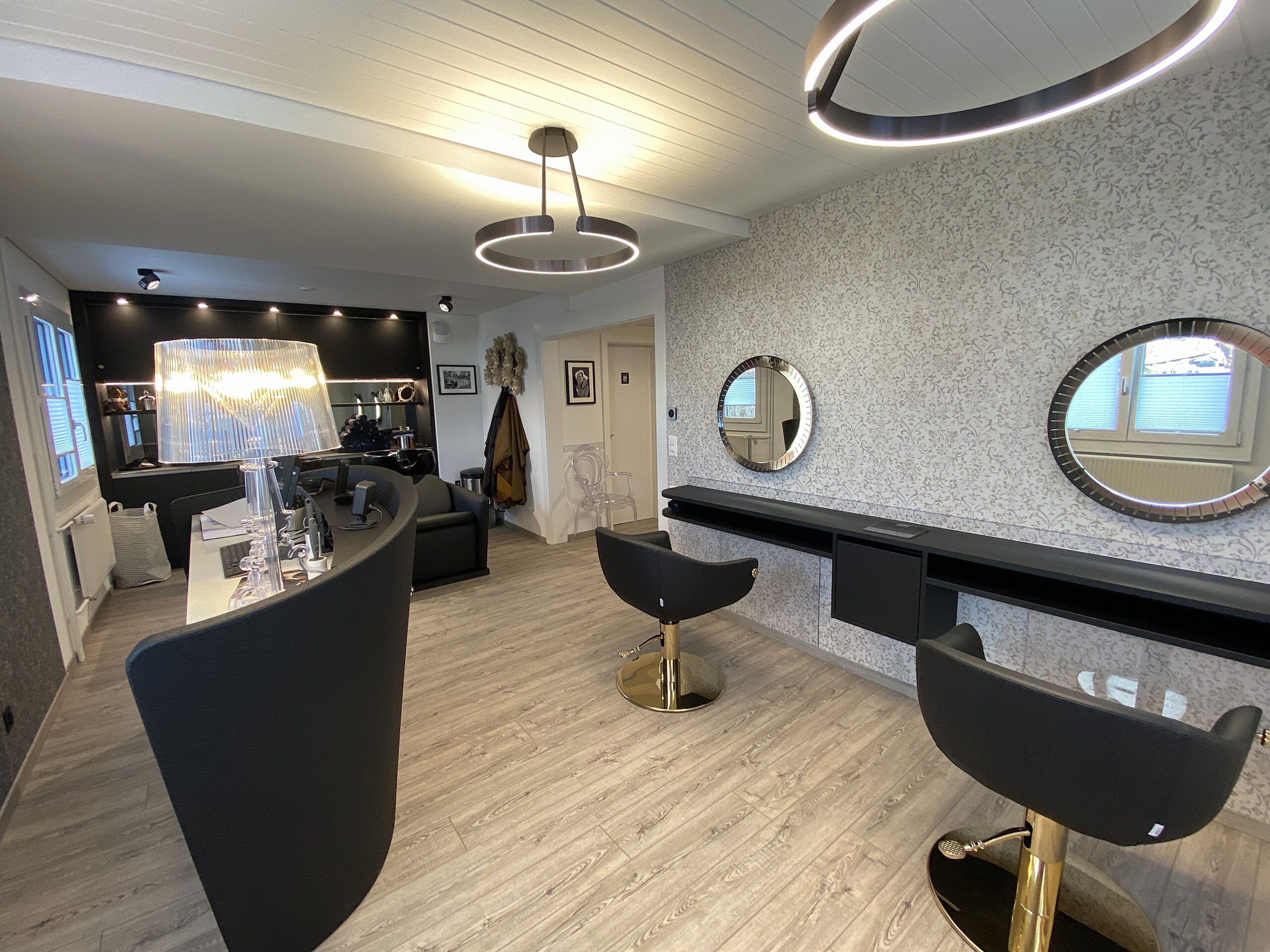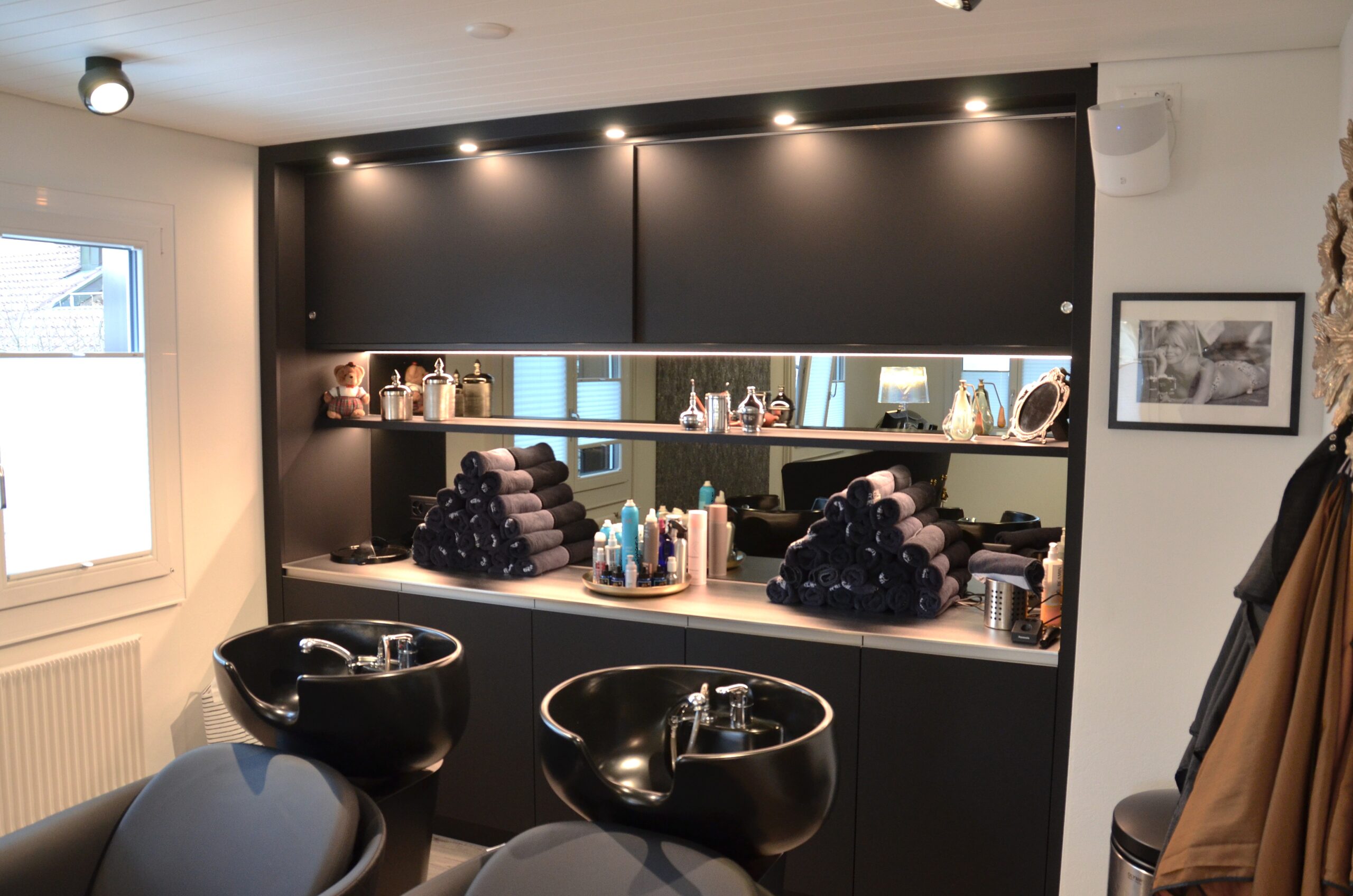 Diese moderne Küche überzeugt durch eine klare Formensprache und sorgfältig abgestimmte Materialien. Ein raffiniertes LED-Beleuchtungskonzept sorgt für stimmungsvolle Akzente, während indirektes Licht im Essbereich eine angenehme Atmosphäre schafft. Für ein stimmiges Raumgefühl sorgt zudem eine Decke mit integrierten Akustik-Paneelen. Hochwertige Materialien prägen das Gesamtbild: Eine Dekton-Keramikabdeckung trifft auf supermatte Fenix®-Oberflächen und elegante Griffleistenprofile in Schwarz. Der Esstisch aus Eiche massiv unterstreicht die moderne Gestaltung. Ausgestattet mit einem Induktionskochfeld von Bora, Küchengeräten von V-Zug sowie pulverbeschichteten Armaturen in mattem Schwarz vereint diese Küche Design, Funktionalität und höchste Qualität.